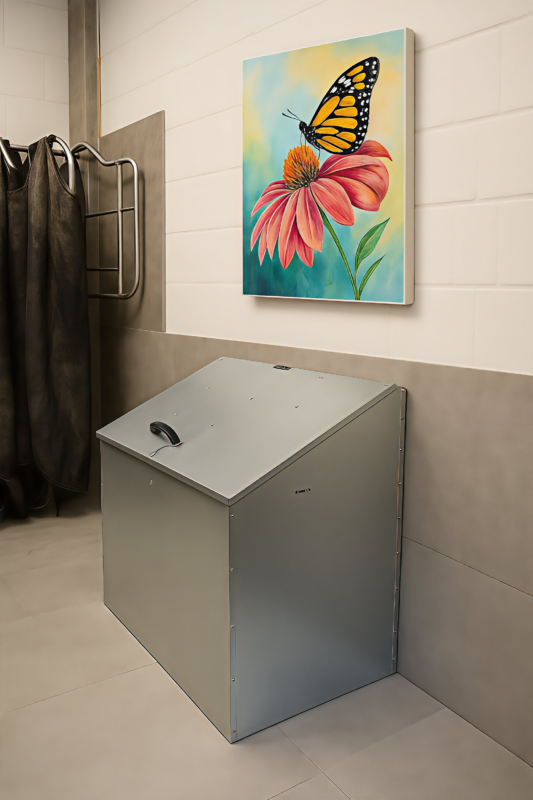 - Futter- und Lagerbereich Futtertonnen, Tröge, Eimer und Säcke sollten trocken, sauber und gut zugänglich stehen. Regale oder erhöhte Ablagen verhindern, dass Futter am Boden Feuchtigkeit zieht.