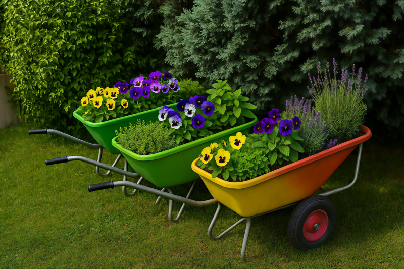 Defekte Schubkarre als Blumenwagen