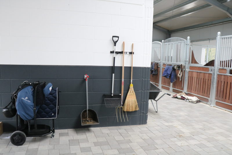- Weide- und Zaunmaterial Litzen, Isolatoren, Pfähle oder Werkzeug für den Zaunbau können gesammelt an einer Wand oder in einer Ecke gelagert werden, damit sie nicht im Stall verteilt liegen.