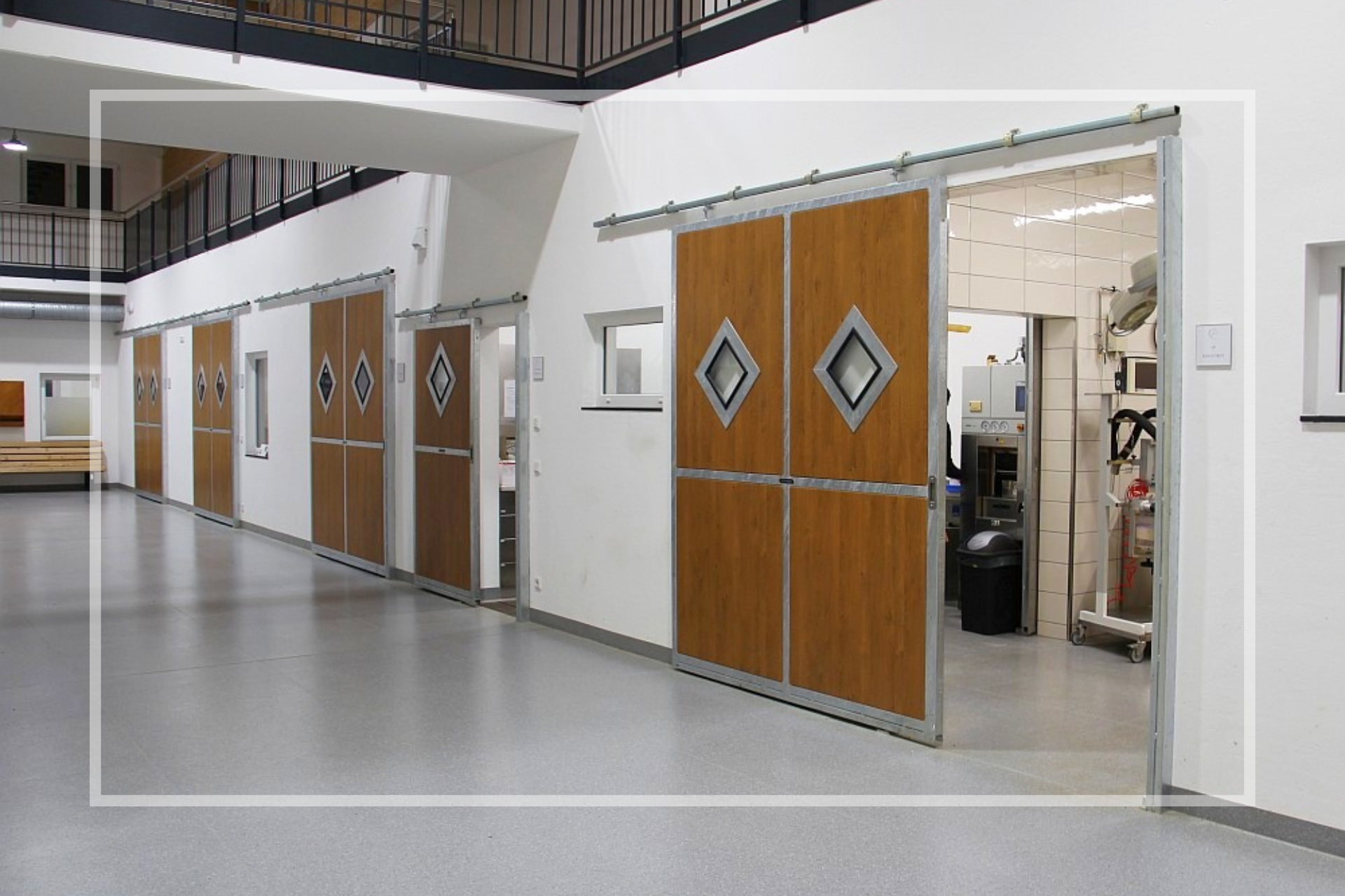 Um den Umbau so zu gestalten, dass die hohen Anforderungen an neue Konstruktionen und Möglichkeiten realisiert werden konnten, benötigten wir umfangreiches Material in Sonderanfertigung. Aus diesem Grund haben wir z.B. Türen und Tore nicht mit Holz versehen, sondern aus Edelstahl gefertigt und mit einer beschichteten Blechfüllung bestückt,, die in Holzoptik einen ästhetischen Eindruck macht. Zudem sind die Türen und Tore leicht zu reinigen und zu desinfizieren, halten Pferdetritten und andere starke Belastungen dauerhaft stand. Zusätzlich lassen sich die Schiebetüren sehr leicht und leise verschieben, sodass ein angenehmes Arbeiten möglich ist.
