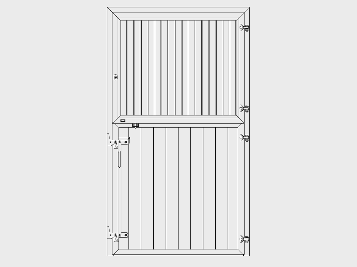 Diese Growi® Stalltür mit Drehfenster hat die Maße 1300 x 2400 mm, ist gerade geschnitten und besteht aus zwei Teilen. Die Stalltür kann von innen und aussen geöffnet werden. Sie wird mit 30 mm Denyaholzfüllung geliefert. Tür: Doppelhubverschluss und Kugelgriff, Fenster: Drehriegel. Öffnungsrichtung: DIN rechts.