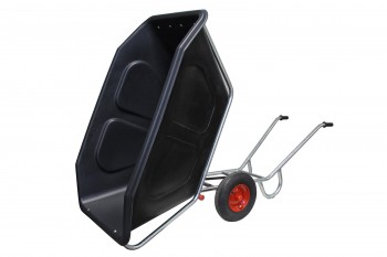 Grossvolumige Schubkarre mit robuster Kunststoffmulde. Fahrgestell feuerverzinkt, mit Kippmechanismus durch Gasdruckstossdämpfer, Inhalt ca. 500 Liter, Gesamtlänge ca. 2000 mm, Muldenlänge ca. 1650 mm, Gesamtbreite ca. 900 mm, Gesamthöhe ca. 870 mm. Diese Schubkarre eignet sich ideal für trockenes Heu und Stroh. Zur Entmistung empfehlen wir unsere Kippkulis oder unsere Universalkulis.