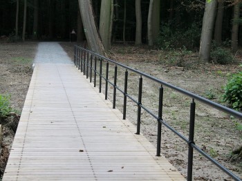 Diese Steganlage am Schloss Benkhausen im zur Stadt Espelkamp gehörenden Ortsteil Gestringen ist Teil des dort geschaffenen Rundwanderweges. Dieser rund zwei Kilometer lange Weg führt durchs Biotop im Erlenbruchwald und ist damit zu einem der auf dem Wanderweg markierten Fotopunkte geworden. Er wird durch eine U-Eisen-Unterkonstruktion getragen, an der auch ein Handlauf bzw. dessen Hauptstützen einseitig angebracht ist. Nach der Feuerverzinkung und Grundierung wurde Lack des Handlaufs in der Farbe DB 703 Eisenglimmer angebracht.